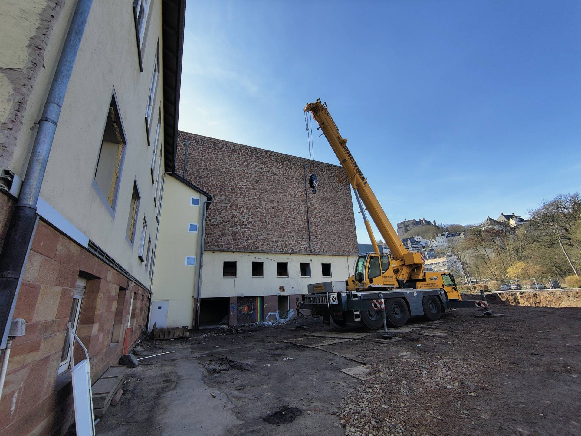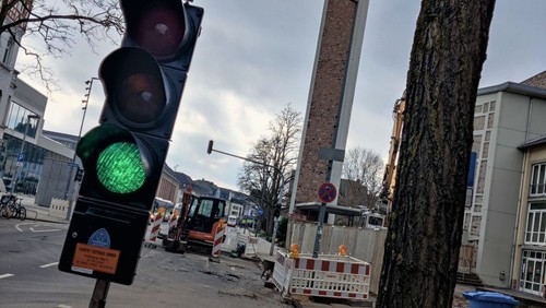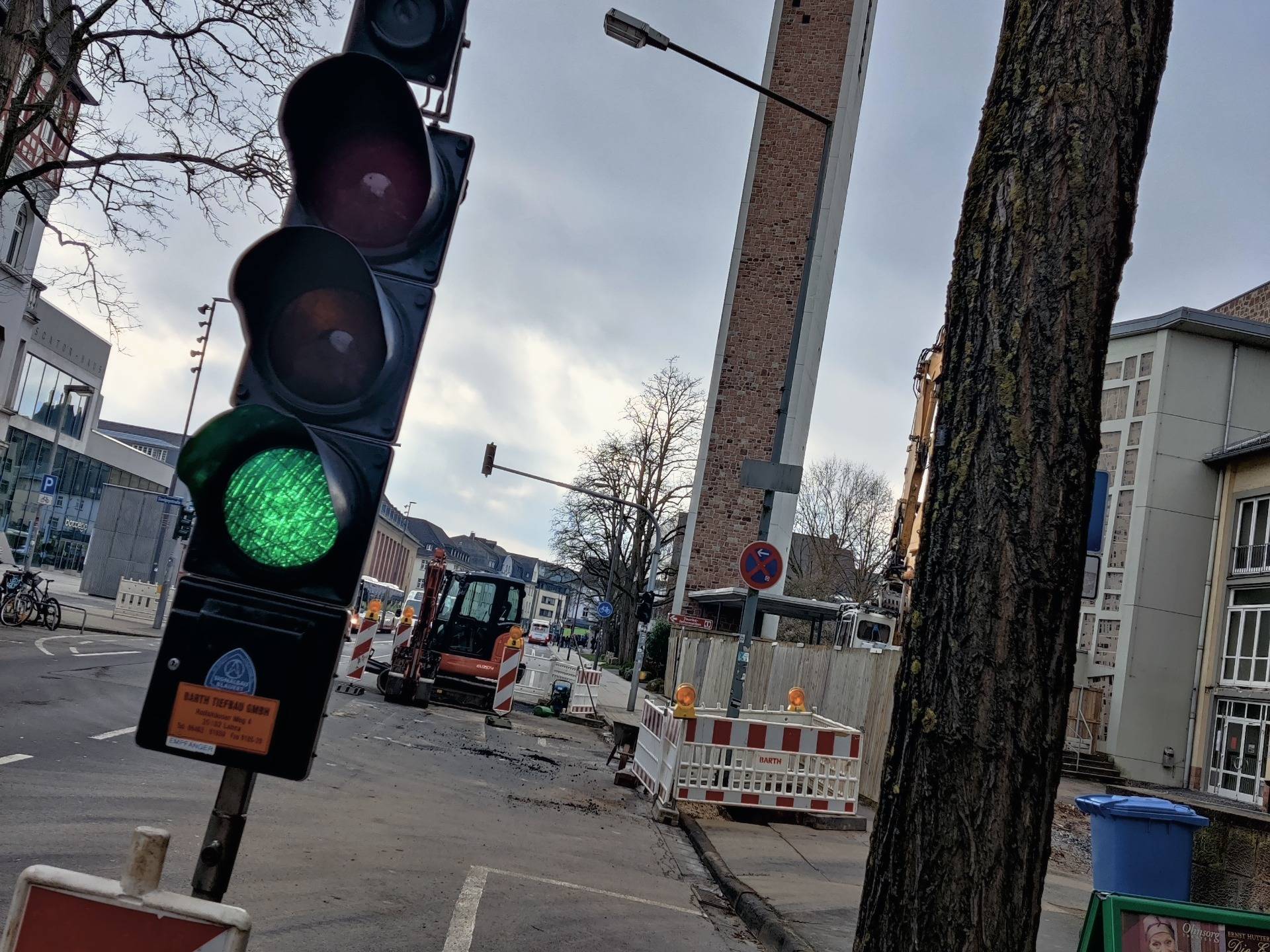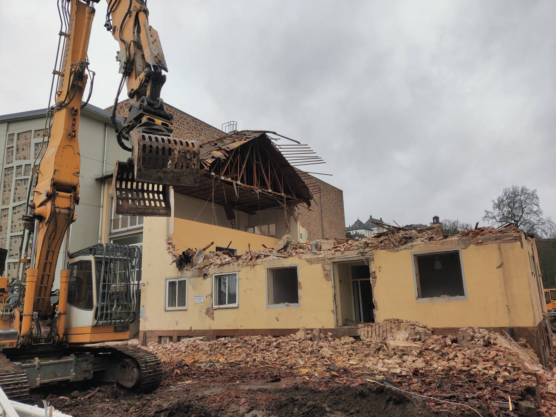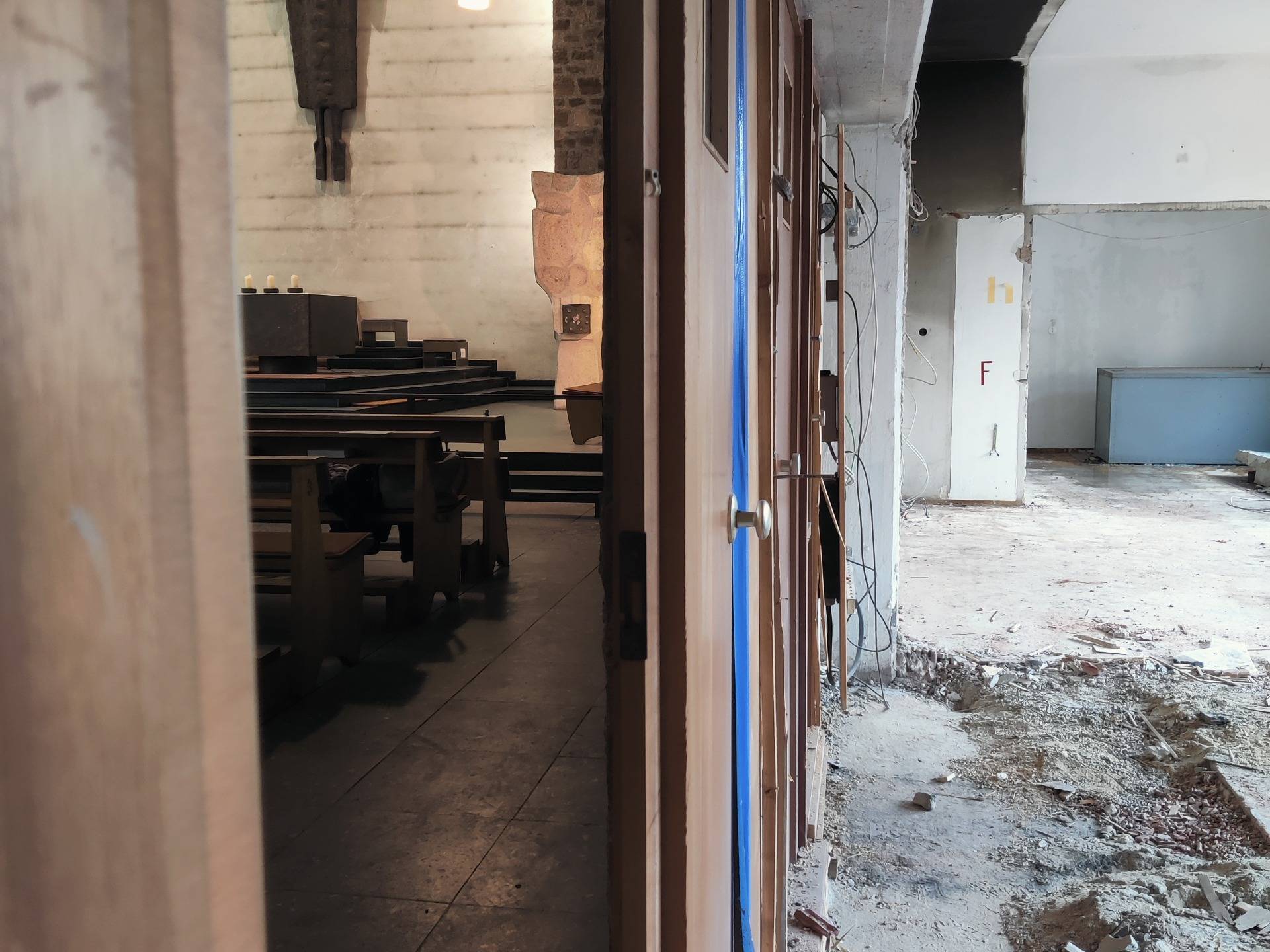 Alle Türen zur Baustelle sind inzwischen verschlossen oder verklebt, um die Kirche bestmöglich vor Staub zu schützen. Da das nicht immer ganz geholfen hat, wurde die ein oder andere Veranstaltung in der Kirche mit besonderer Baustellenatmosphäre ausgetragen. Die Rückwände und die Decke der Beichtstühle wurden abgebaut und die Türöffnungen hinter der Holzverkleidung zugemauert. Erstmals war der Straßenverkehr in der Biegenstraße durch die Baumaßnahme betroffen: Damit die Leitungen zum Gemeindehaus abgeklemmt werden konnten, musste die Straße aufgerissen und der Verkehr aufgrund der Sperrung einer Fahrbahn mit einer Baustellenampel geregelt werden. Ab dem 14.02. begannen die Abrissarbeiten am Gemeindehaus, die bis Ende Februar abgeschlossen sein sollen.